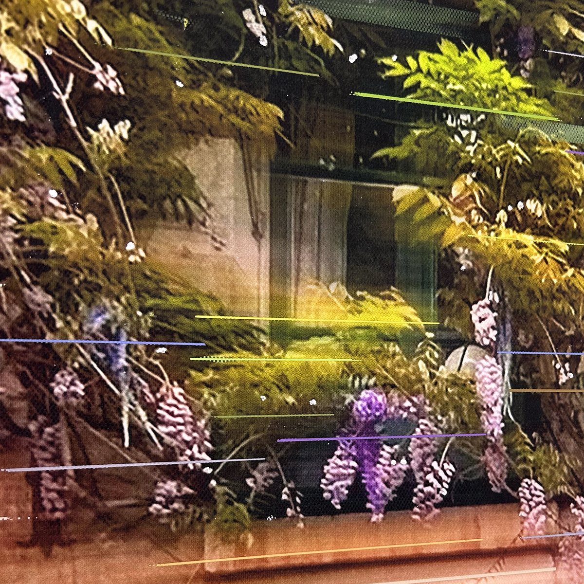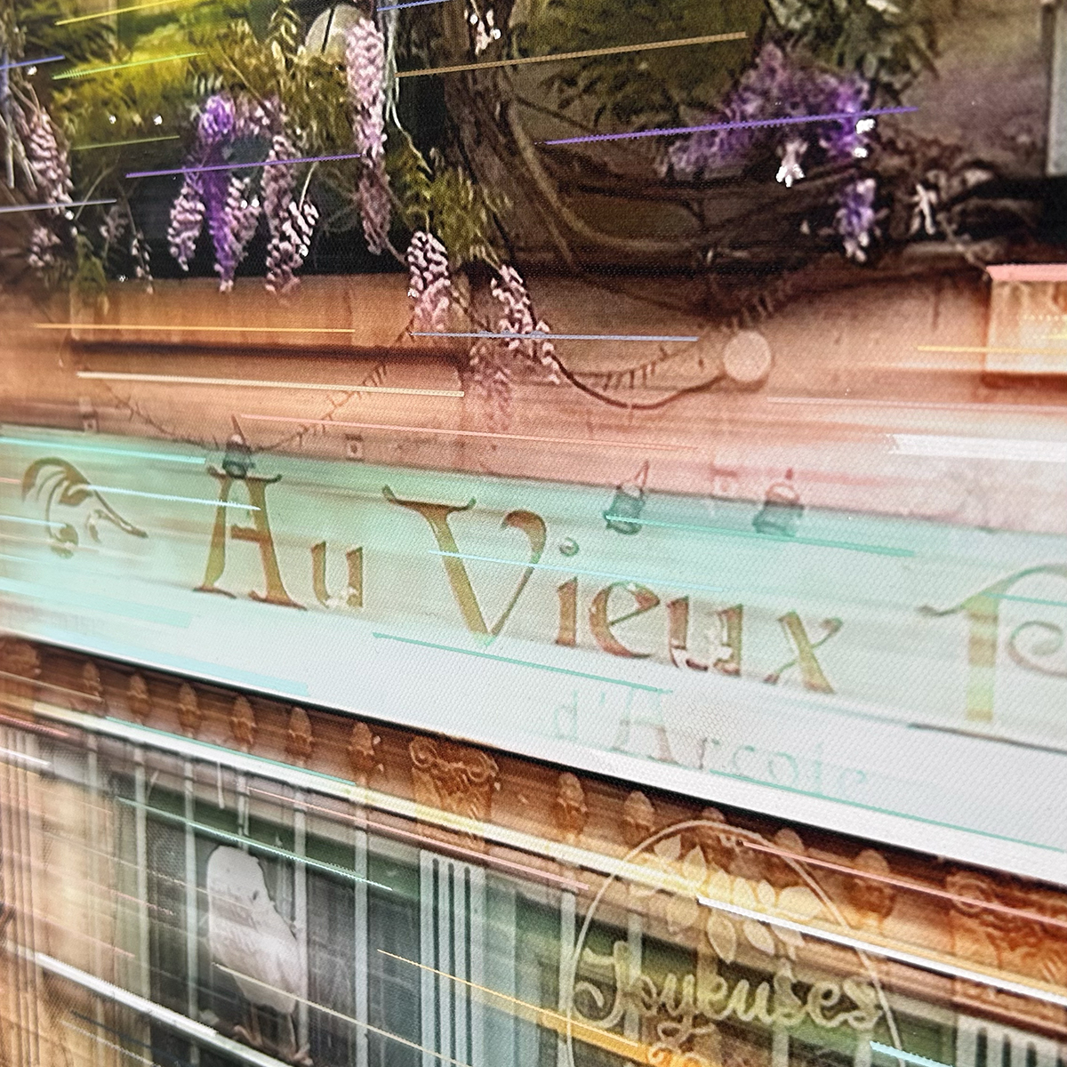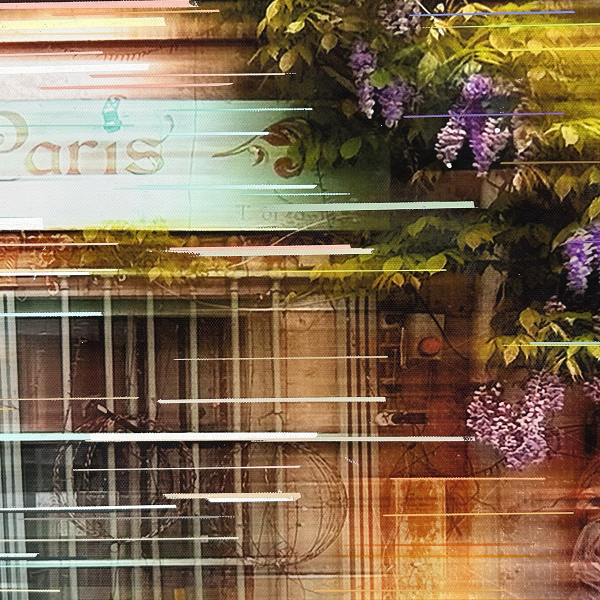 Created using own photography digitally modified, giclée printed on to canvas then overlaid with acrylic and spray paints, screen printing and silver leaf.