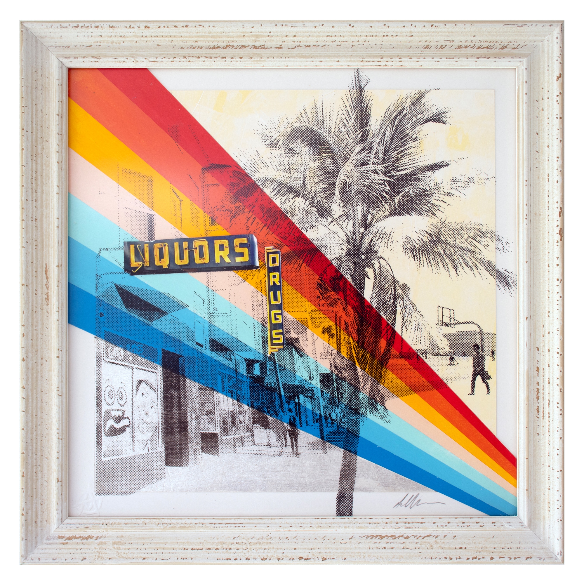 Featuring original imagery from San Francisco and Venice Beach, LA. Inspired by 90’s magazines like Raygun, this abstract piece was originally created for another project but I decided it fitted better as part of this new small collection. The 70s style rainbow adds a splash of colour to this unique one-off piece.