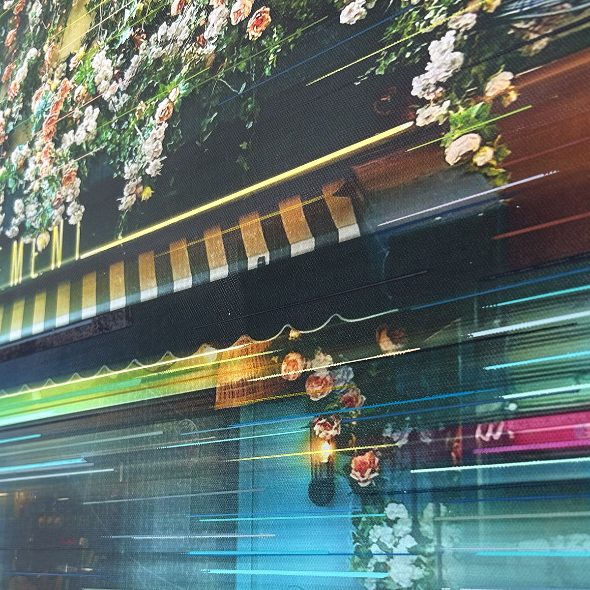 Created using own photography digitally modified, giclée printed on to canvas then overlaid with acrylic and spray paints, screen printing and copper leaf.