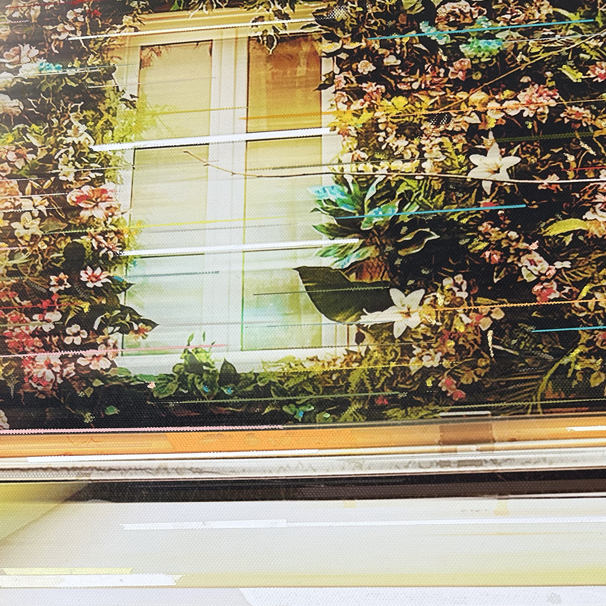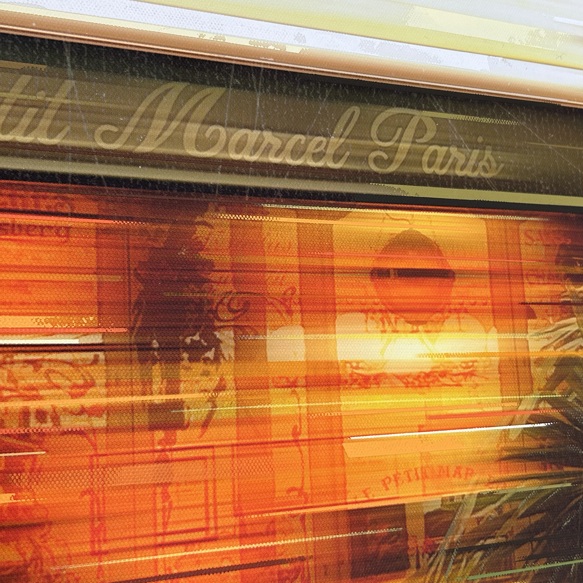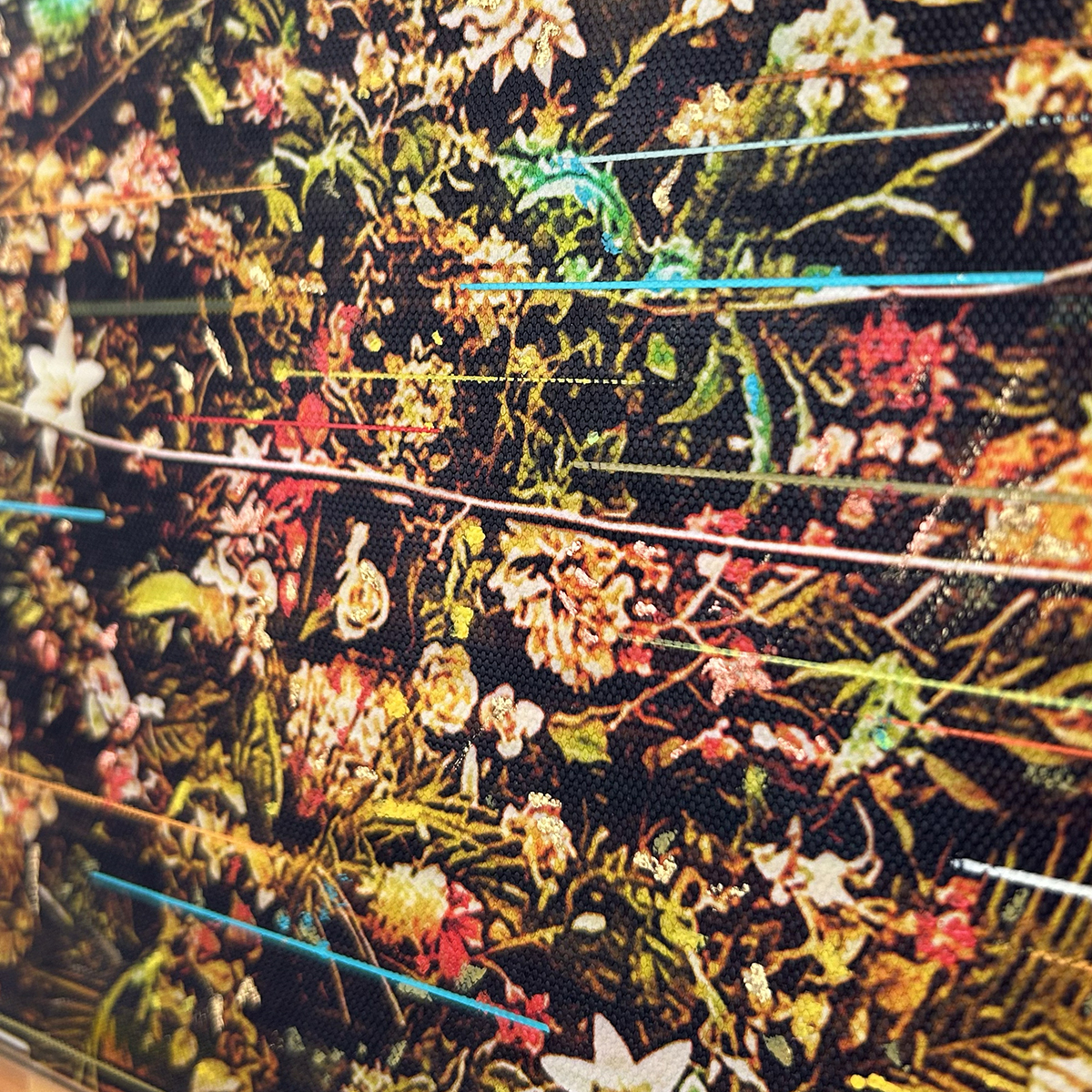 Created using own photography digitally modified, giclée printed on to canvas then overlaid with acrylic and spray paints, screen printing and 22 carat gold leaf and copper leaf.