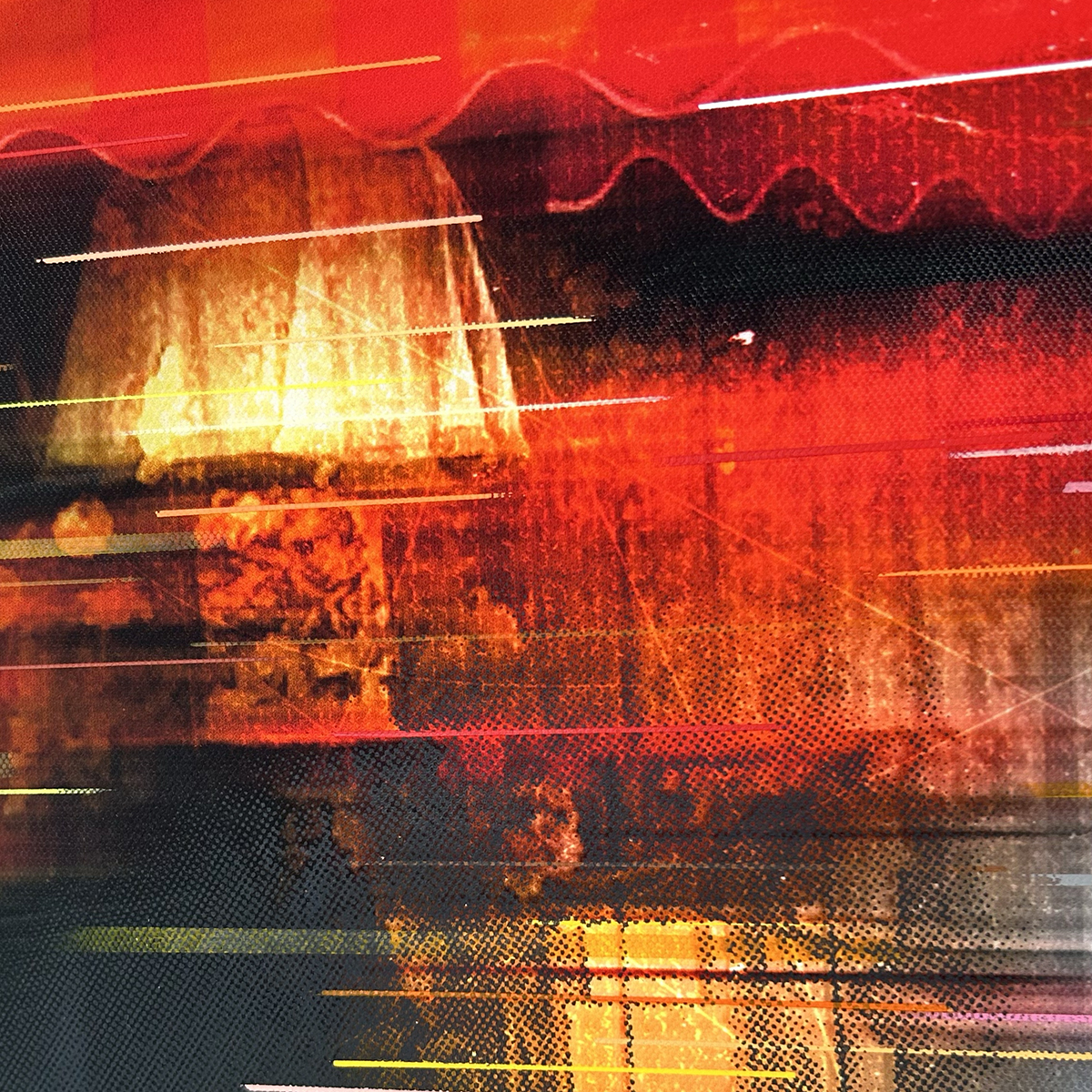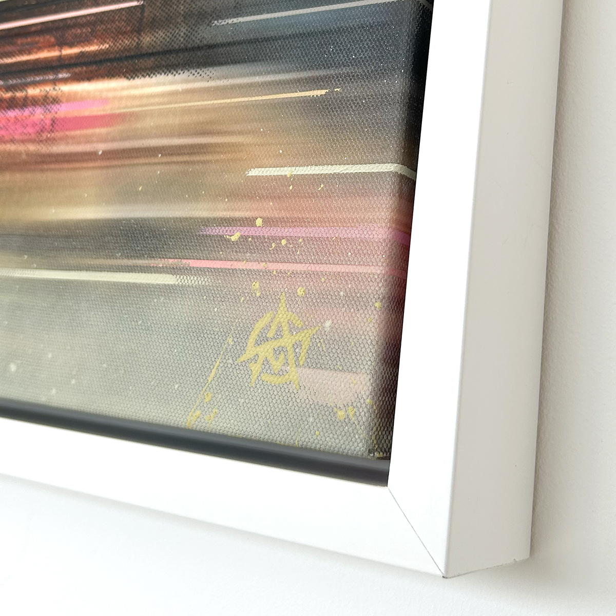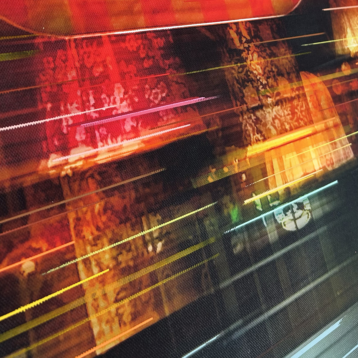 Created using own photography digitally modified, giclée printed on to canvas then overlaid with acrylic and spray paints, screen printing and 22 carat gold leaf and copper leaf.